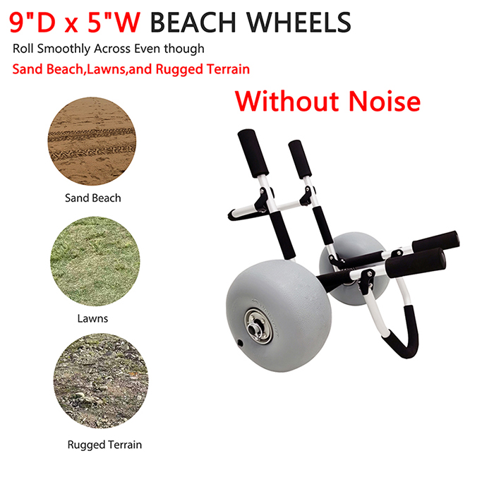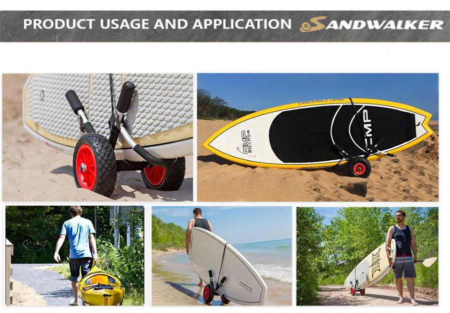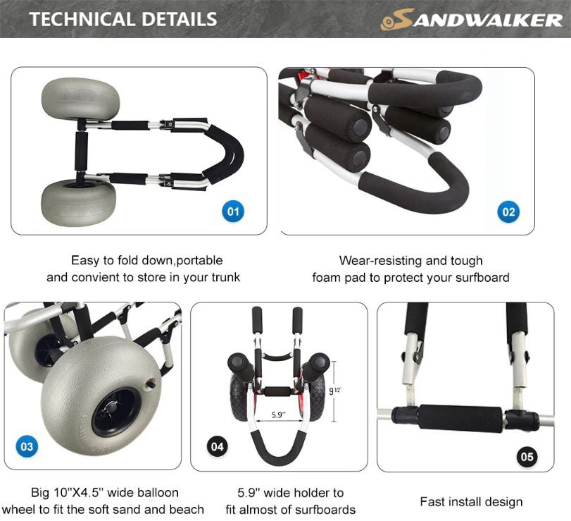 Manövrierfähigkeit: Ausgestattet mit 10-Zoll-Ballonrädern bietet der Surfboard Beach Cart hervorragende Manövrierfähigkeit im Sand. Diese Räder sind speziell dafür konzipiert, mühelos über sandiges Gelände zu gleiten und den Transport Ihrer Ausrüstung zum und vom Strand zu erleichtern. Genießen Sie ein reibungsloses und problemloses Transporterlebnis.