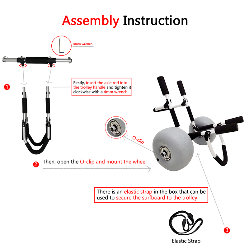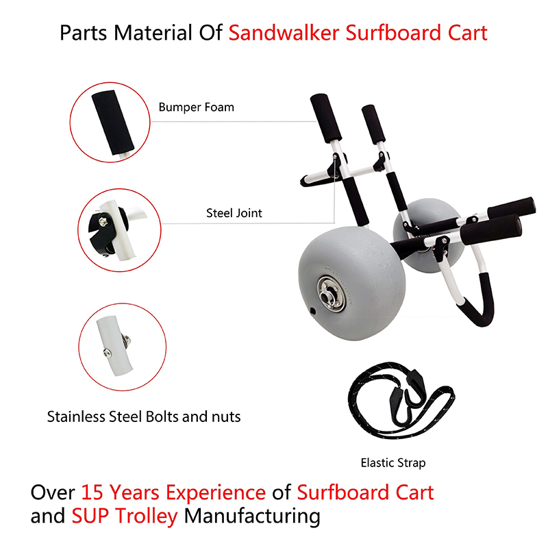 Sicherer und geschützter Transport: Der Strandwagen verfügt über Nylon-Kunststoffteile, Bungee-Spanngurte und Schaumstoff-Stoßpolster, die alle darauf ausgelegt sind, Ihr Surfbrett während des Transports sicher und geschützt zu halten. Die Kombination dieser Eigenschaften stellt sicher, dass Ihr Surfbrett in ausgezeichnetem Zustand bleibt, frei von Kratzern oder Schäden durch Bewegung oder Stöße.